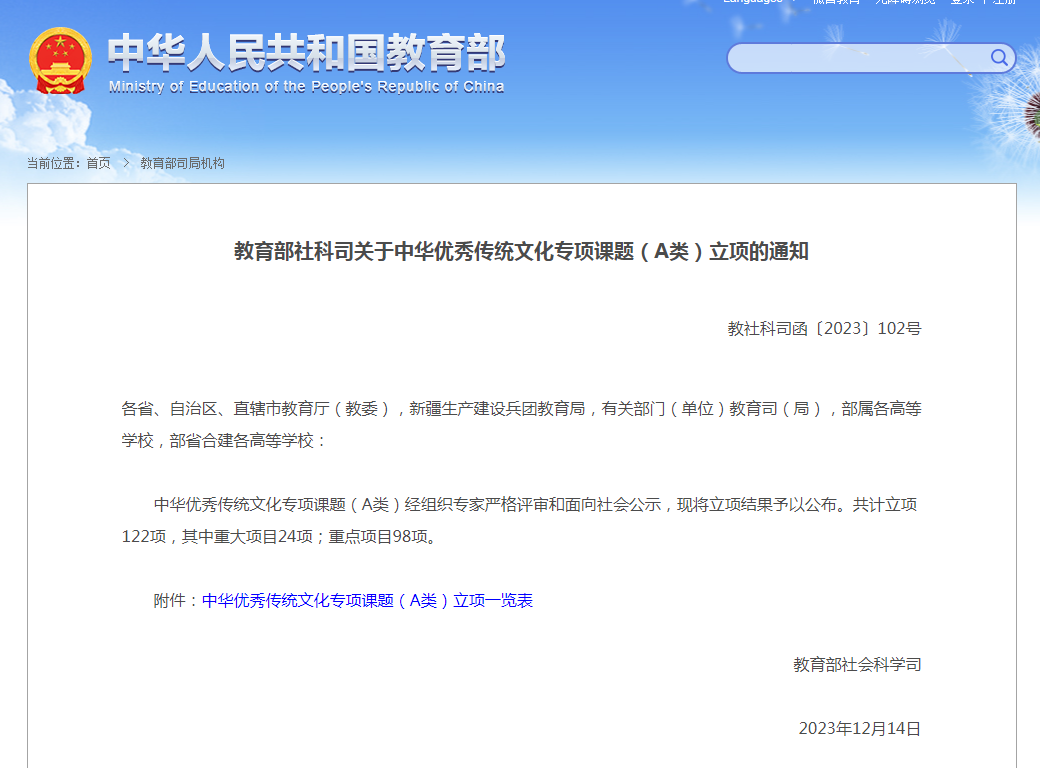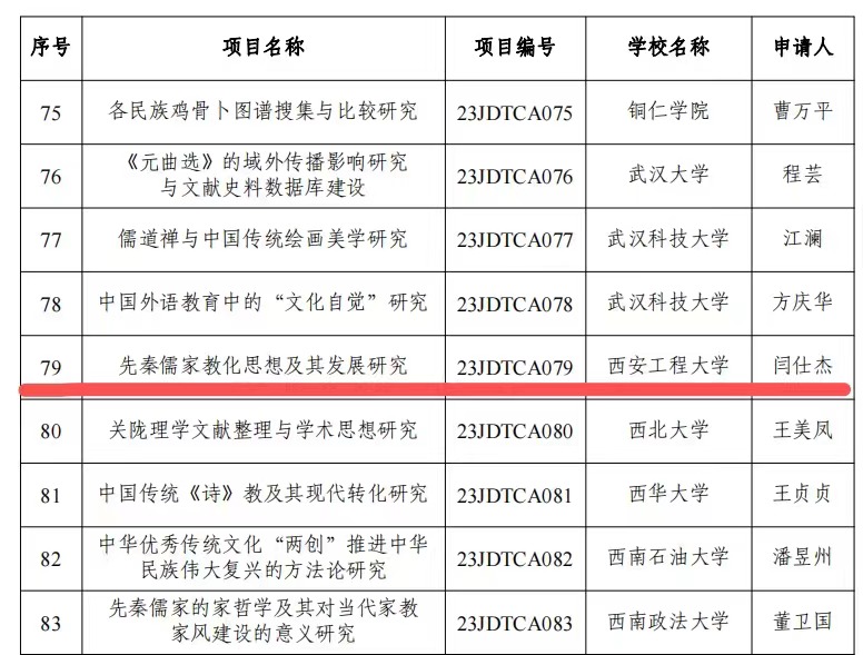 近日,教育部社科司公布了中华优秀文化课题(A类)重点项目的评审结果。澳门十大信誉好的网站闫仕杰副教授申报的“先秦儒家教化思想及其发展研究”(获批经费20万元),获中华优秀传统文化专项重点课题立项,这是学校教师首次获批中华优秀文化研究(A类)专项课题重点项目。该课题旨在重点从《论语》《孟子》和《荀子》这三部先秦儒家经典文献的视角,探讨先秦儒家教化思想的发展及其对中国文化传统的影响。通过对三部经典文献的深入研究和分析,总结先秦儒家教化思想的核心内涵和发展脉络,探讨其对社会伦理、个人修养以及政治理论等方面的贡献。