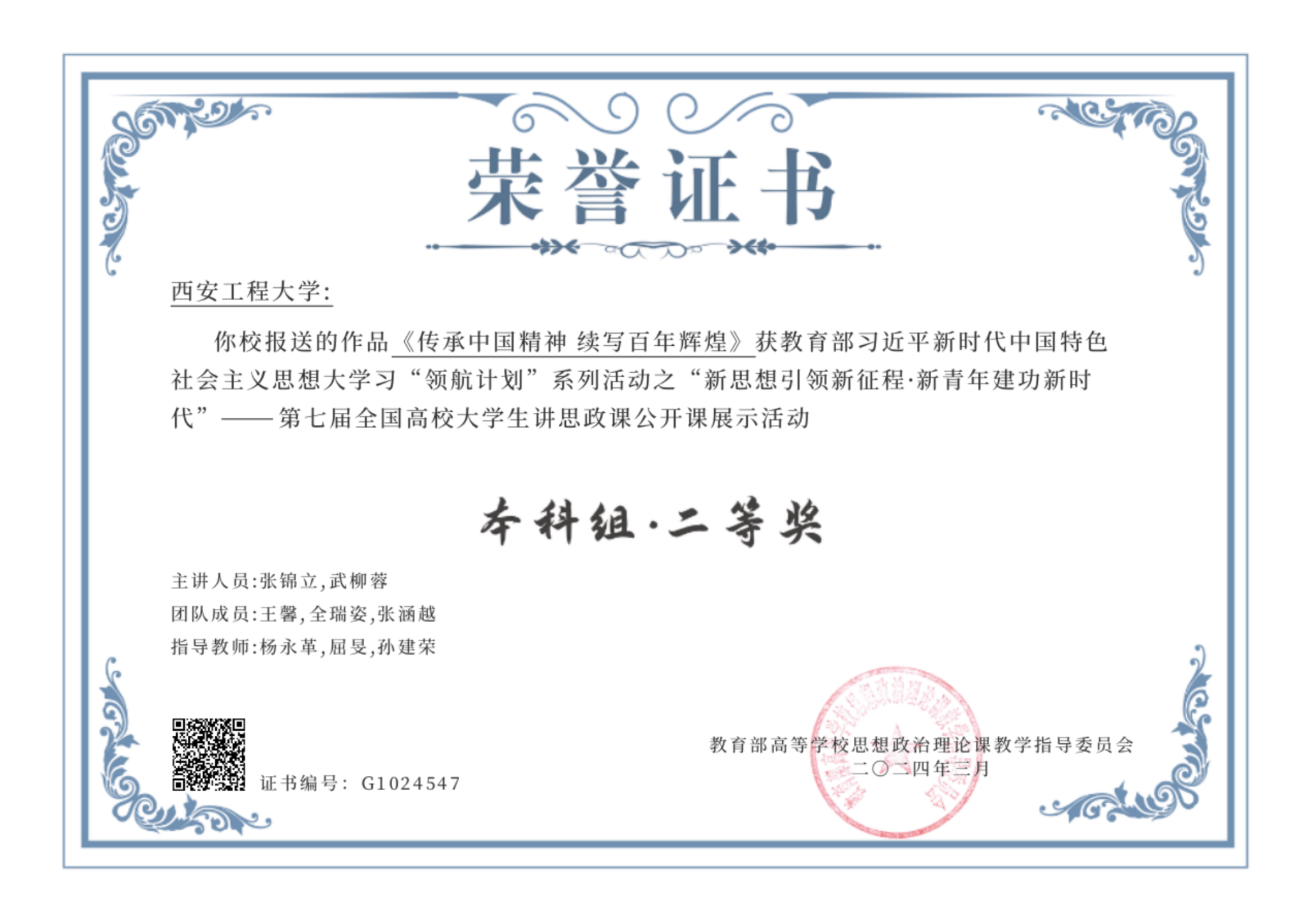 近日,由教育部高校思政课教学指导委员会主办、南开大学承办的“新思想引领新征程·新青年建功新时代”第七届全国高校大学生讲思政课公开课展示活动获奖名单公布,十大信誉官网澳门十大信誉好的网站教师杨永革、屈旻、孙建荣指导,研究生张锦立、武柳蓉主讲的“场馆里的思政课”——《传承中国精神 续写百年辉煌》作品,荣获第七届全国高校大学生讲思政课公开课展示活动二等奖。