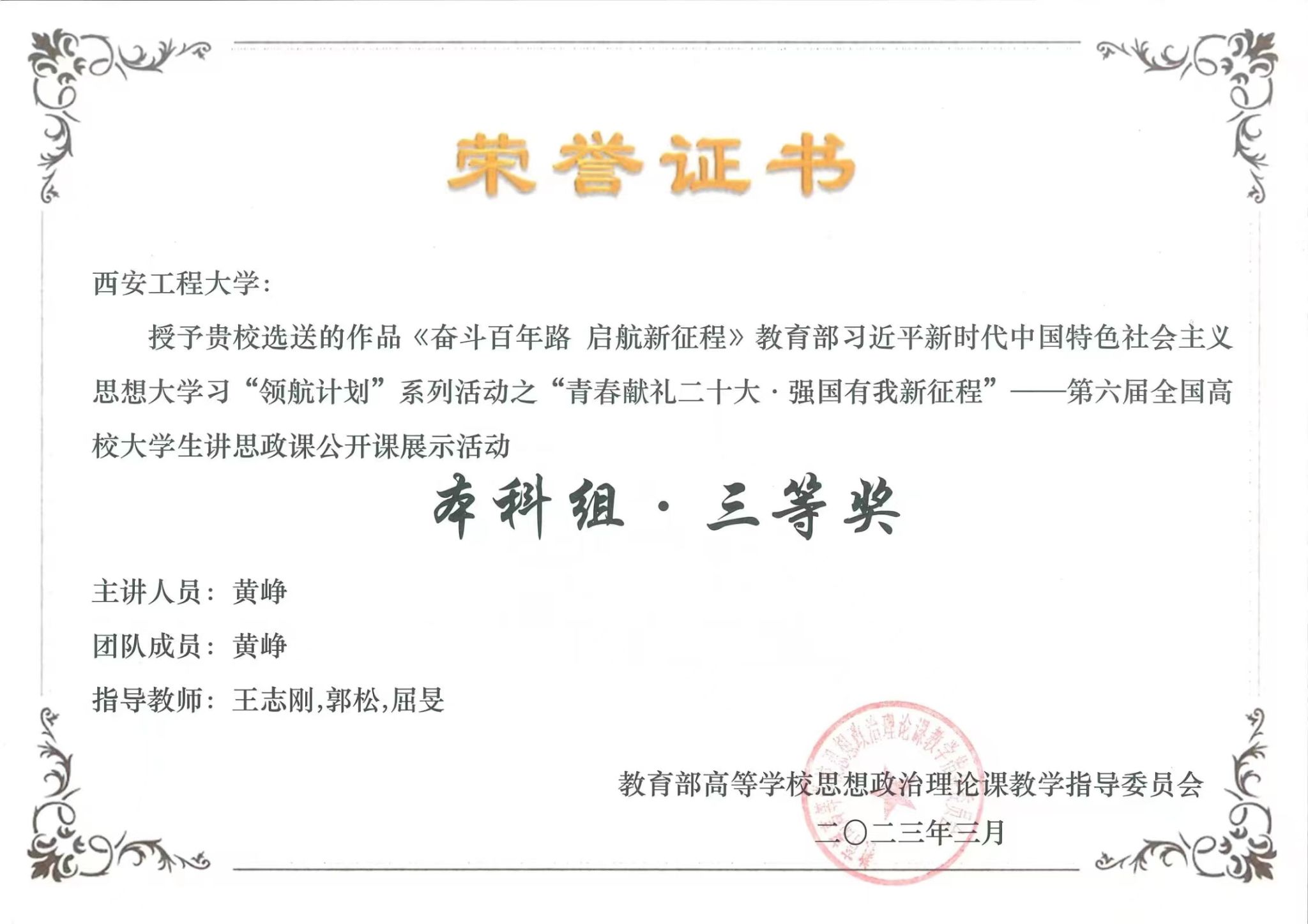 近日,教育部高校思政课教学指导委员会公布了习近平新时代中国特色社会主义思想大学习“领航计划”第六届全国高校大学生讲思政课公开课展示活动评选结果,十大信誉官网澳门十大信誉好的网站教授王志刚等指导马克思主义理论2020级研究生黄峥主讲的作品《奋斗百年路 启航新征程》,荣获第六届全国高校大学生讲思政课公开课展示大赛三等奖。