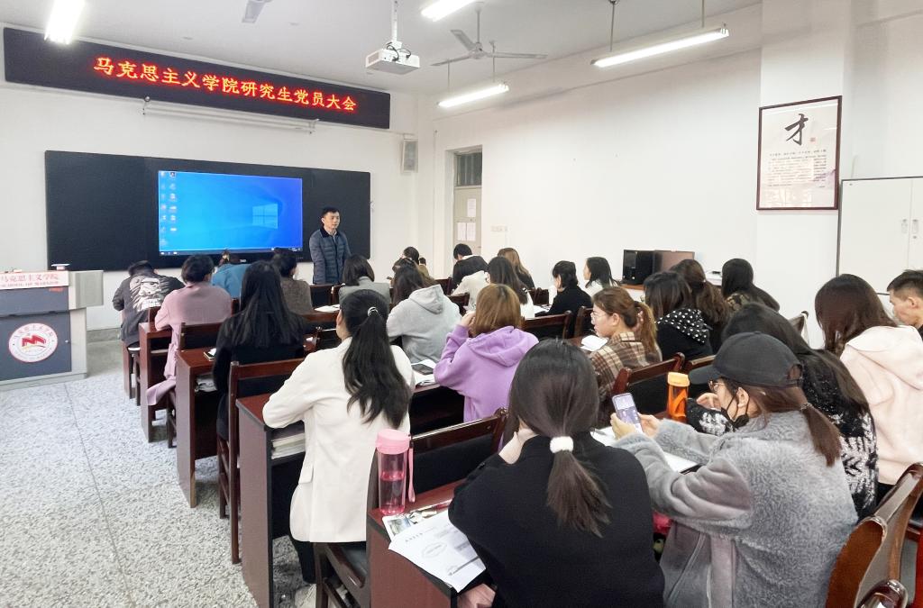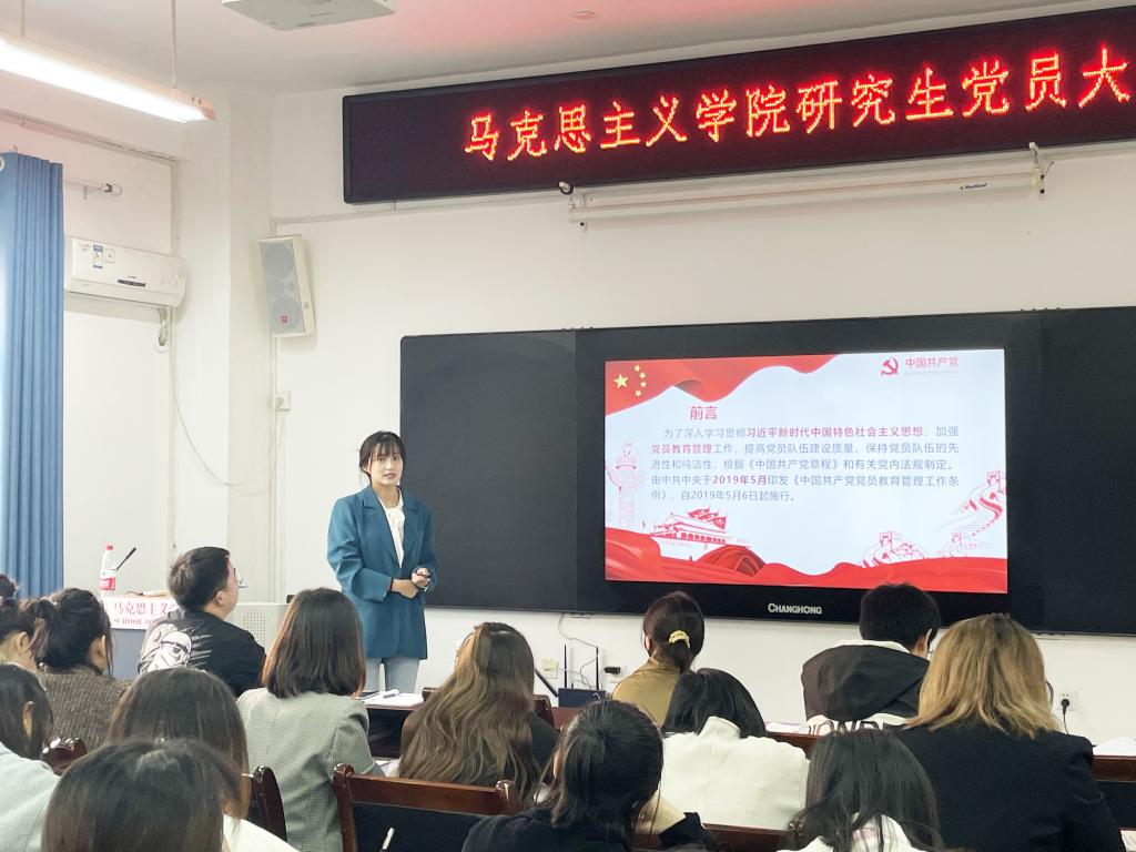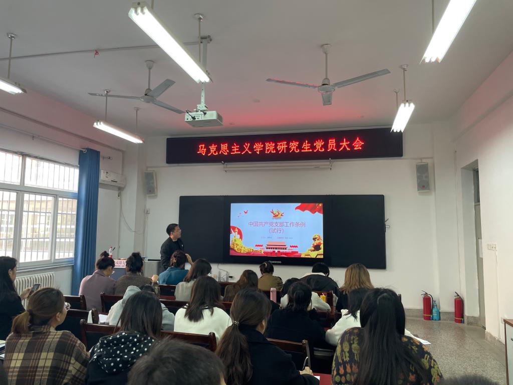 10月21日,澳门十大信誉好的网站召开研究生党员专题学习会,学习了《中国共产党支部工作条例(试行)》《中国共产党党员权利保障条例》《中国共产党普通高等学校基层组织工作条例》和《中国共产党党员教育管理工作条例》等文件。学院思想政治教育研究生党支部和马克思主义理论研究生党支部共计40余名党员参加了学习会,会议由马克思主义理论研究生党支部书记孙建荣主持。
