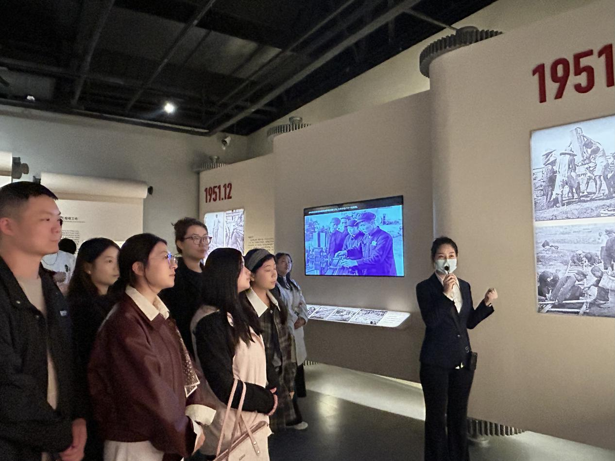 参观过程中,讲解员和老厂长向师生们详细讲解和回顾了咸阳国棉一厂作为国家第一个纺织厂的建设背景、发展历程及其在中国纺织工业史上所书写的光辉篇章。展览馆内丰富的历史实物、详实的文献资料以及生动的图片影像,全面展现了我国纺织工业从无到有、由弱到强的奋斗足迹,使师生们对新中国工业建设的艰辛与伟大有了更为直观和深刻的认识。