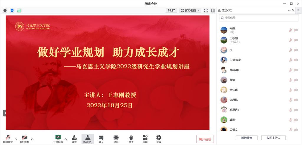 10月25日,澳门十大信誉好的网站组织开展2022级研究生学业规划线上专题讲座,学院院长王志刚教授主讲,学院研究生秘书李益鹏、辅导员孙建荣以及2022级全体研究生参加了讲座。