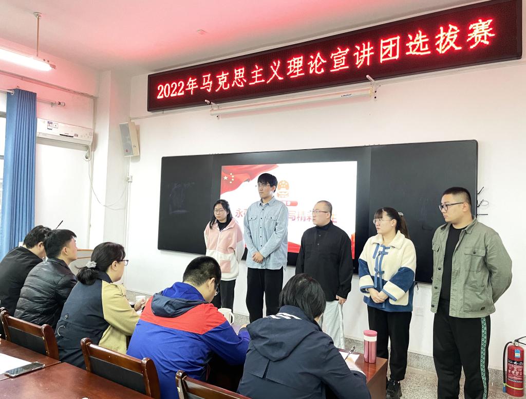 11月8日,澳门十大信誉好的网站举办主题为“青春心向党 奋斗正当时”的青年马克思主义理论宣讲团选拔赛。学院党委书记杨永革,教师聂迅、刘婷婷、孙建荣和李益鹏担任评委,学院青年马克思主义理论宣讲团成员及2022级全体参赛选手参加了活动。