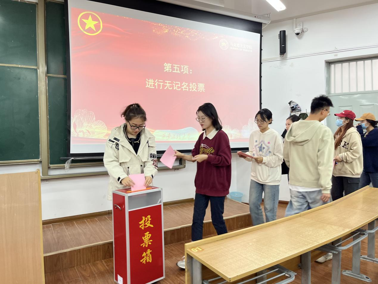 大会在庄严的国歌声中拉开了序幕。傅博娜老师宣读了大会选举办法,介绍了选举工作相关情况及候选人基本情况,通过了大会选举监票人和计票人。随后,大会按照选举办法,经过清点到会人数、发放选票、无记名投票、计票等程序,成功选举出李斌等四人校团代会代表、乔秀洁等三人校研代会代表。大会圆满完成各项议程后,在中国共产主义青年团团歌中落下帷幕。