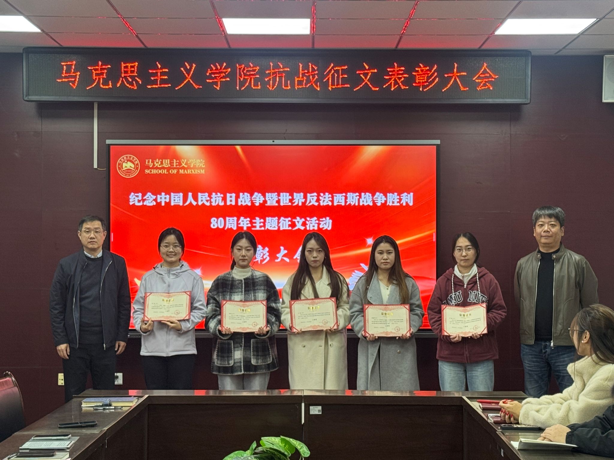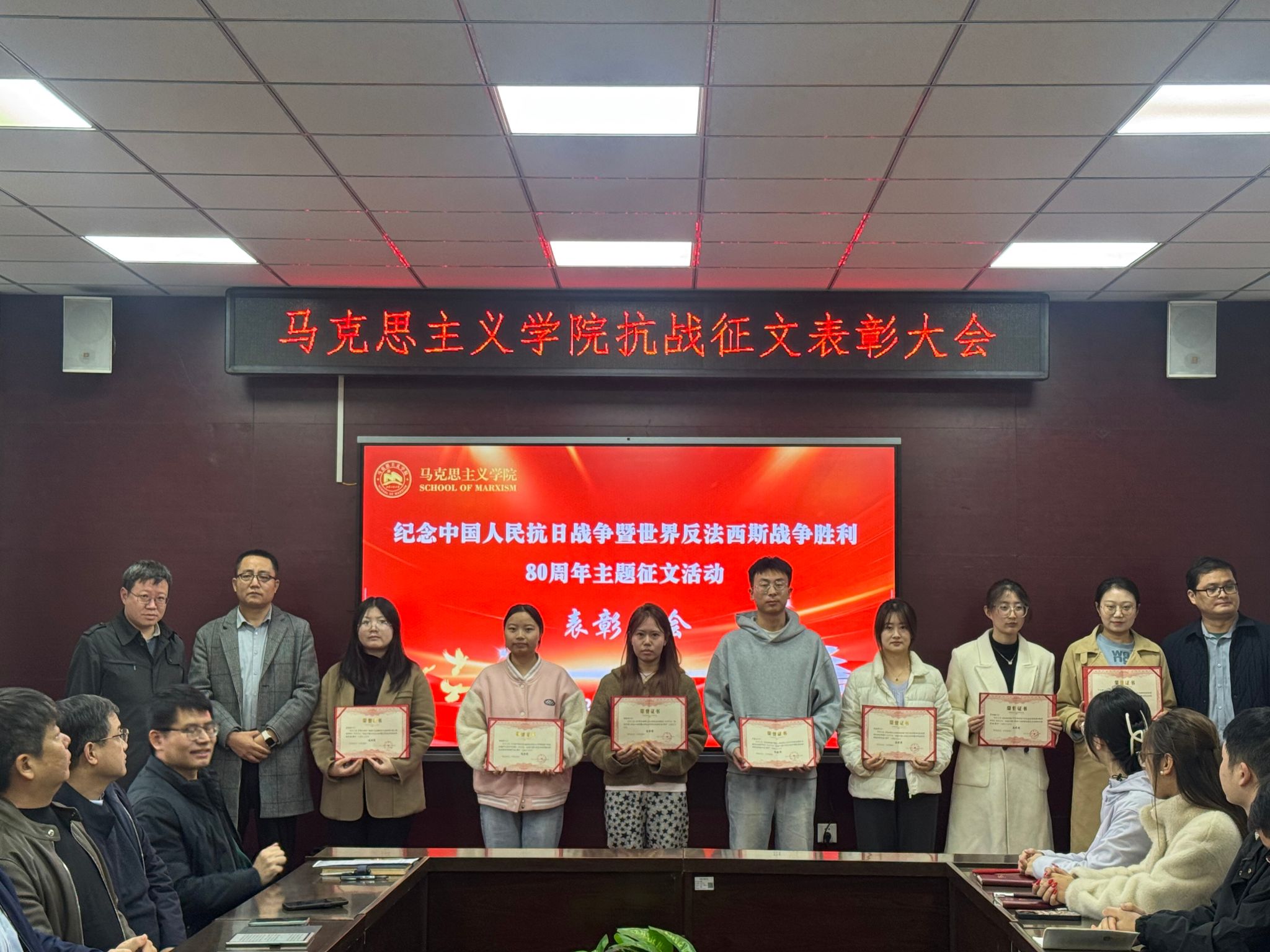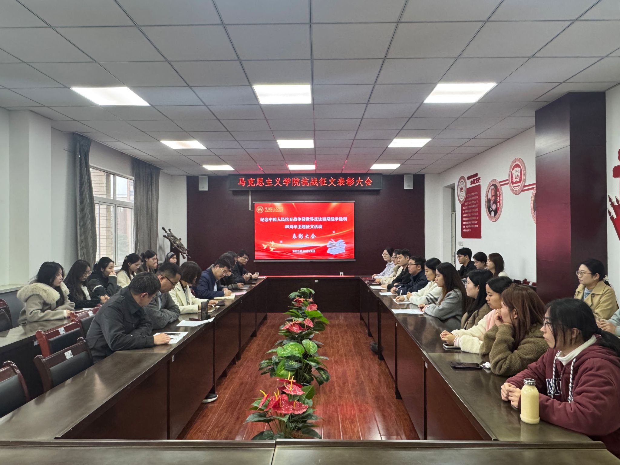 10月22日,澳门十大信誉好的网站在203会议室举办“纪念中国人民抗日战争暨世界反法西斯战争胜利80周年”主题征文表彰活动。澳门十大信誉好的网站党政领导班子成员、教师代表、硕士研究生参加表彰活动。
