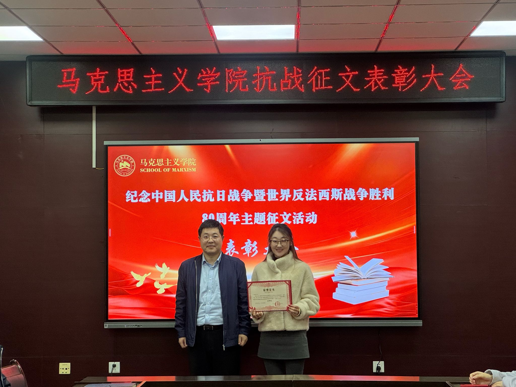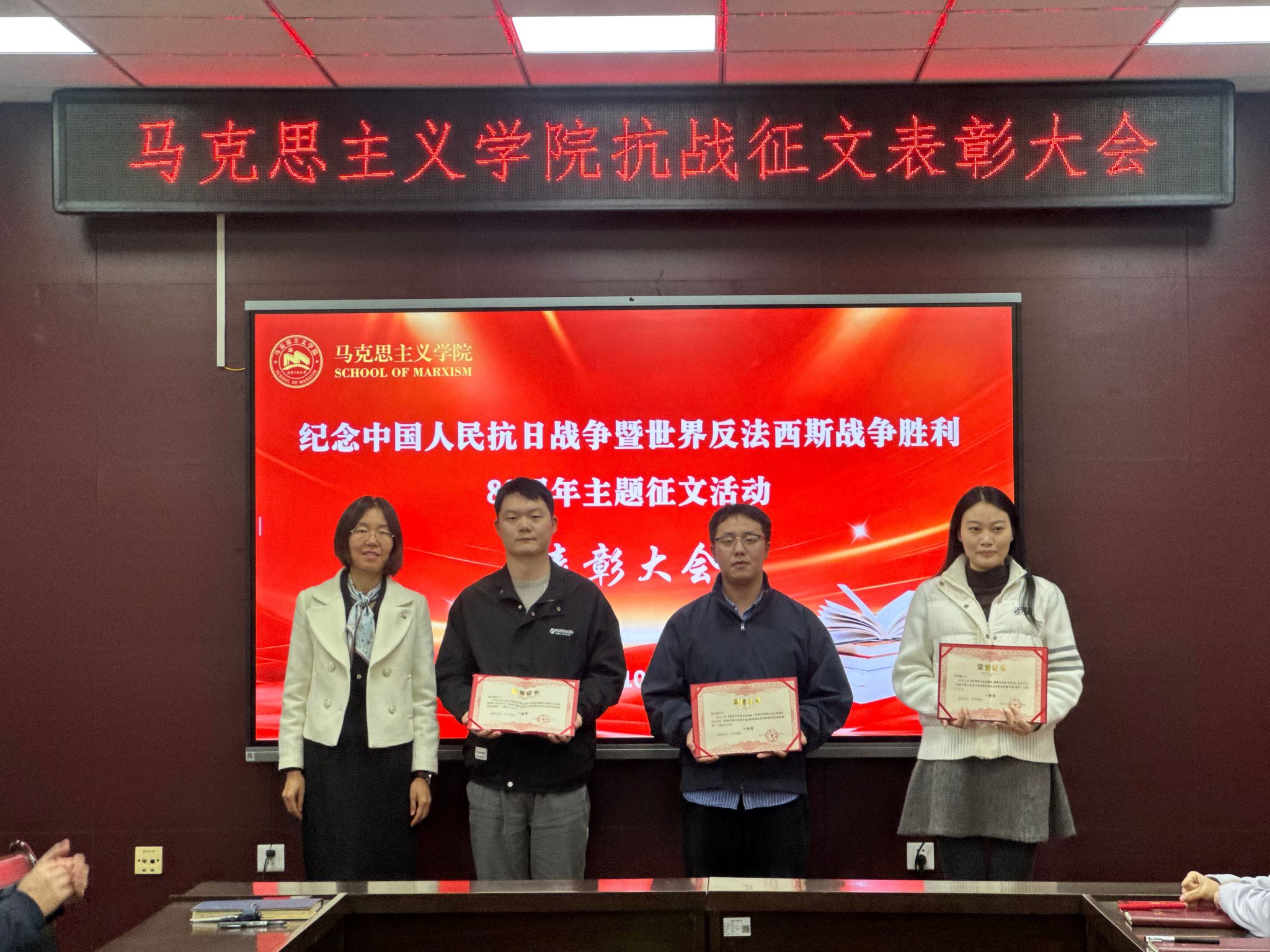 会上,学院党委副书记傅博娜(主持工作)首先宣读表彰文件,她指出,学院于9月底开展了“纪念中国人民抗日战争暨世界反法西斯战争胜利80周年”主题征文活动,同学们积极参与,经个人投稿、专家评审,于鑫获特等奖、张永强等三名同学获一等奖、田欣之等五名同学获二等奖、李佳楠等七名同学获优秀奖,希望广大研究生以获奖同学为榜样,不断提升理论水平,锤炼学术修养,遵守学术道德,深耕理论沃土,取得更大学业成就。