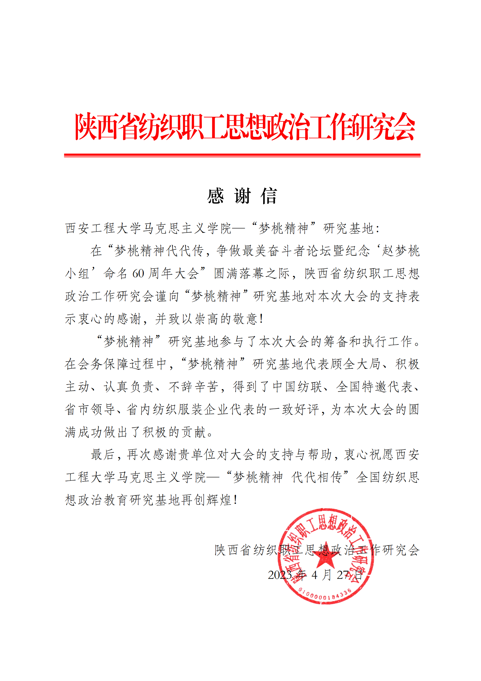 4月28日,“梦桃精神代代相传”全国纺织思想政治教育研究基地收到来自陕西省纺织职工思想政治工作研究会的感谢信,对研究基地在“梦桃精神代代传 争做最美奋斗者”论坛暨纪念赵梦桃小组命名60周年大会的筹备阶段所作的工作表示衷心的感谢。