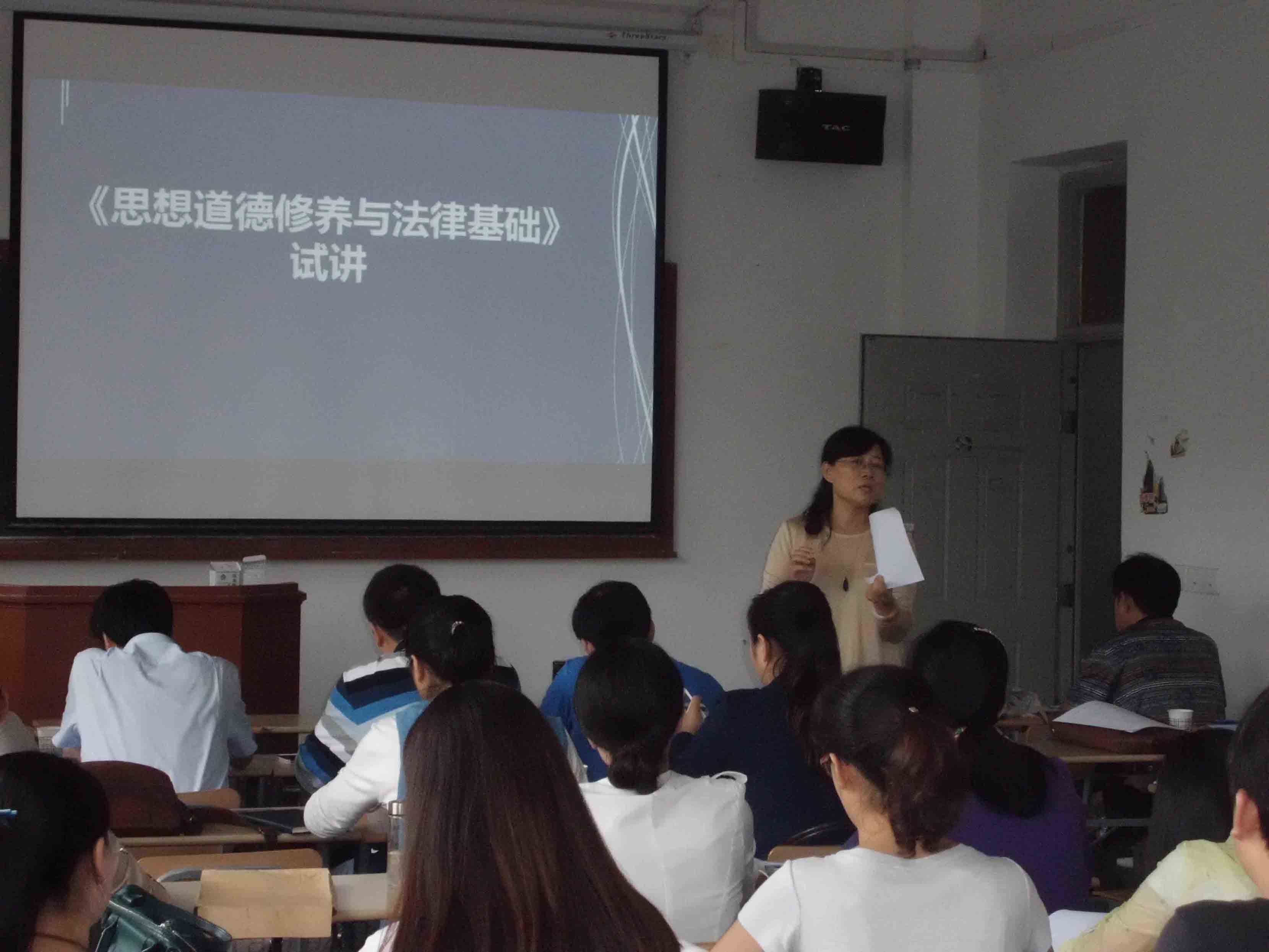 为确保课程教学质量,在前期点对点单独辅导的基础之上,9月10日下午,思政部开展了2014-2015学年兼职教师《思想道德修养与法律基础》课程集中试讲与示范教学活动。活动由思想政治教育教研室主任张敏教授主持,阮怀堂、连灵、闫仕杰等老师与相关职能部门主管、各学院学生主管作为评委对试讲进行了现场打分,张敏教授和阮怀堂副教授对试讲进行了点评和示范。二十二名兼职教师参加本次试讲。