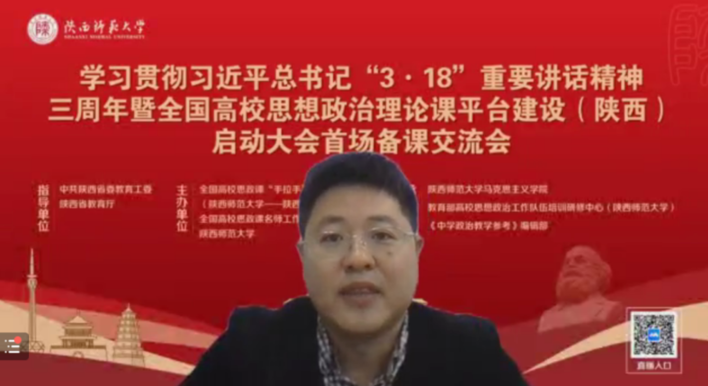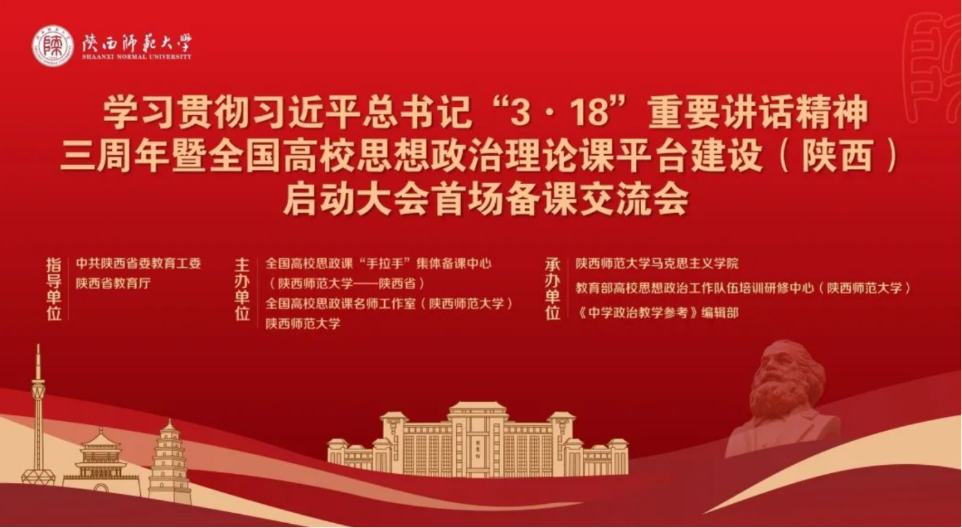 3月19日,为深入学习贯彻习近平总书记在全国学校思想政治理论课教师座谈会上的重要讲话精神,“学习贯彻习近平总书记‘3.18’重要讲话精神三周年暨全国高校思想政治理论课平台建设(陕西)启动大会首场备课交流会”在陕西师范大学召开,会议的主题为“学习贯彻习近平总书记‘3·18’重要讲话精神三周年,推动思想政治理论课均衡发展”。会议议程分为“项目建设启动仪式”和“备课交流活动”两个阶段。澳门十大信誉好的网站全体教师以线上的方式参加了会议。