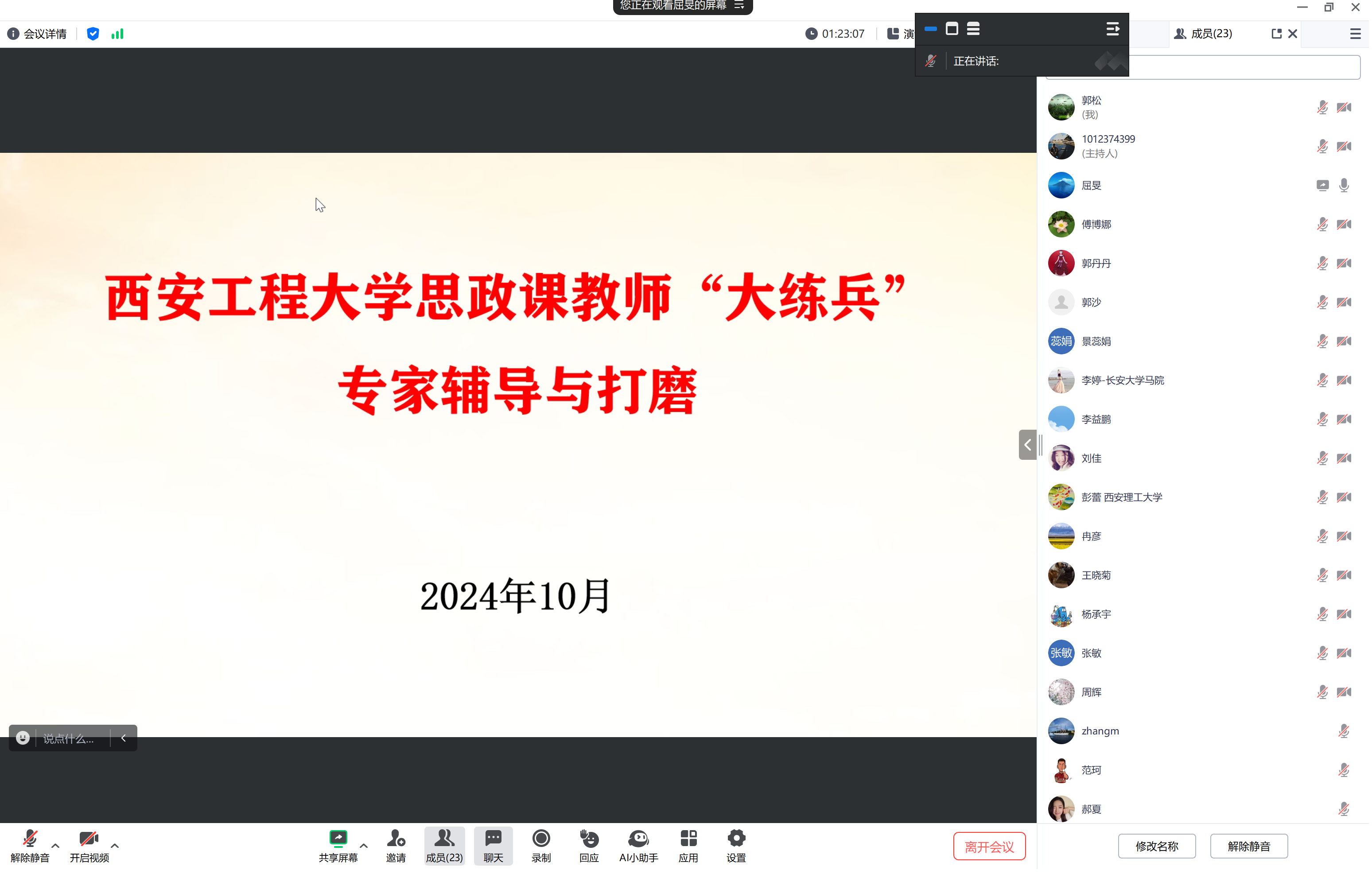 第一阶段,两位专家分别做主题报告,对2024年度思政课教师“大练兵”的规则要求进行了全面解读与分析,从教学选题、课程设计、案例摘选、课堂互动、提出问题、课件制作等方面分享了丰富的经验。第二阶段,每一位参赛教师提出了备赛过程中的问题和疑惑,与专家进行一对一的交流学习,两位专家给出针对性指导意见,希望各位选手能够在现有的基础上进一步明确课程主线、优化内容设置、加强价值引领和信息化教学,注重讲授内容的逻辑性,不断提升思政课教学的吸引力和实效性。